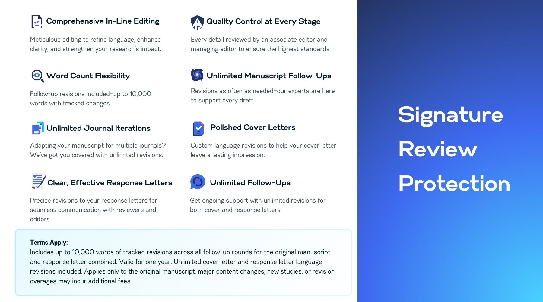 Revisions are limited to 10,000-word track changes total for the original manuscript and response letter combined; in the event of overages, a modest follow up fee can be added. Signature revision protection expires after one year. Includes free, unlimited cover letter and response letter language revisions for the project. Signature revision protection applies only to the original manuscript as a single publishable unit; manuscripts not based upon the original study with respect to study design and data collection will incur additional charges at LetPub's sole discretion.